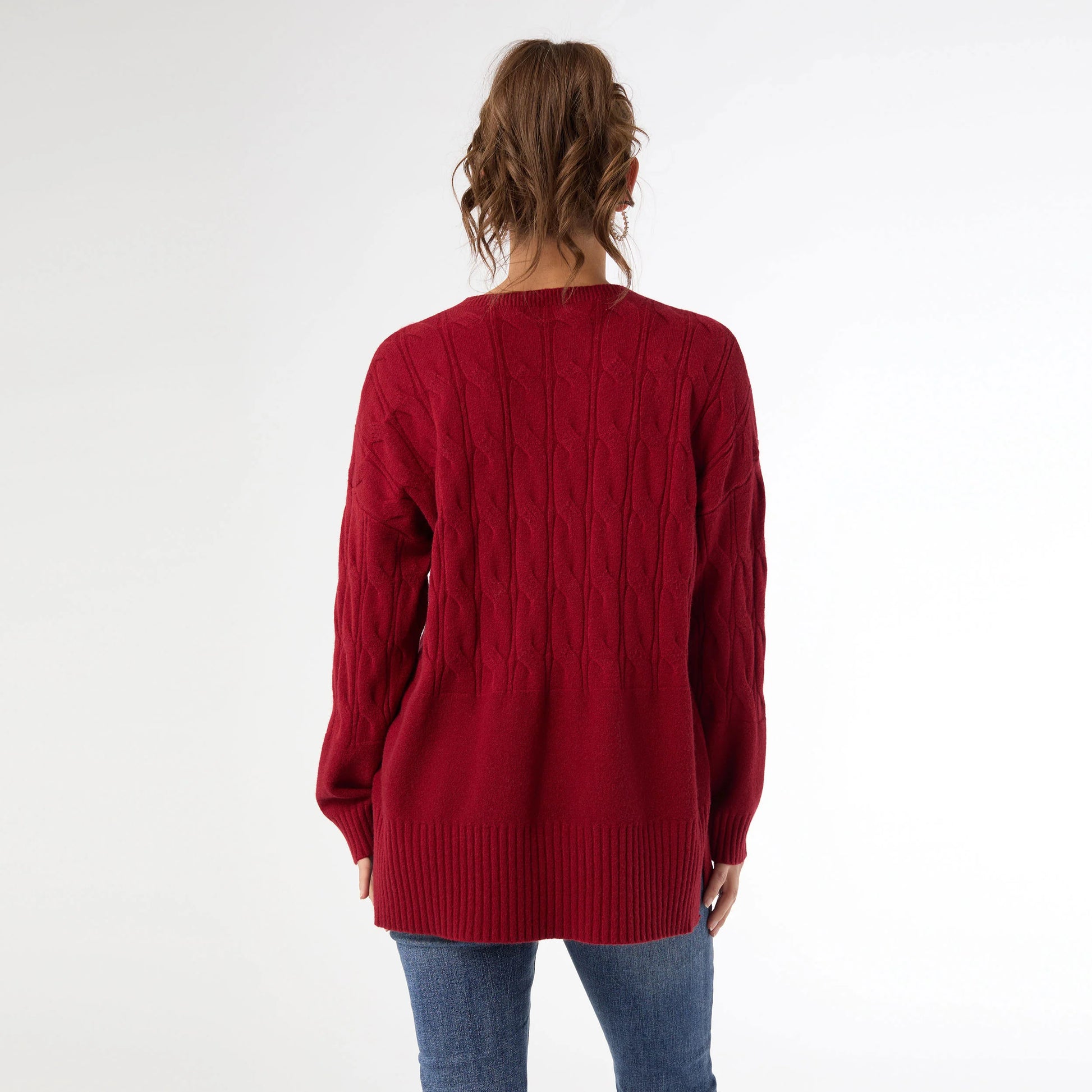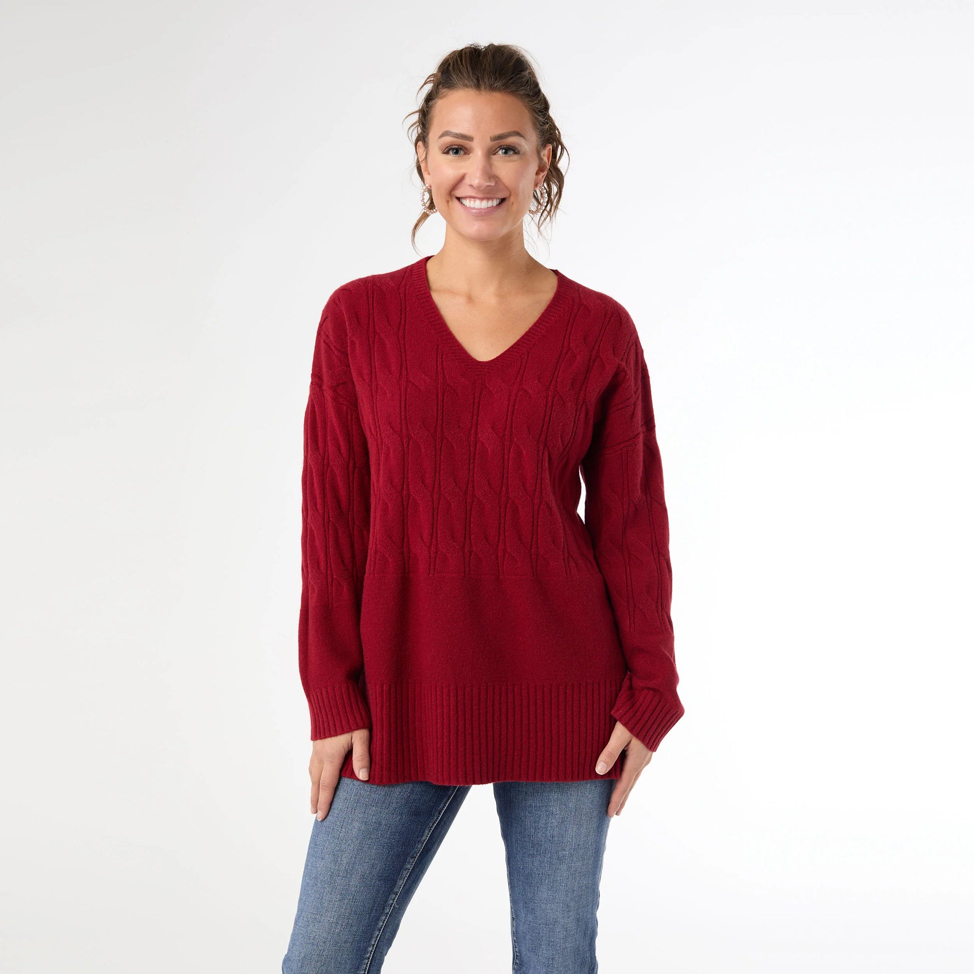 Wrap yourself in pure luxury with our Heavenly-Luxe V Neck Cable Sweater with Rib Bottom. This cozy sweater is crafted from luxuriously soft fabric, making it feel like a warm hug. Complete with long sleeves and cable knit with rib bottom, it's an ideal combination of comfort and practicality. Elevate your everyday style and experience the epitome of cozy with this must-have top. Materials: Viscose/Polyester/Nylon